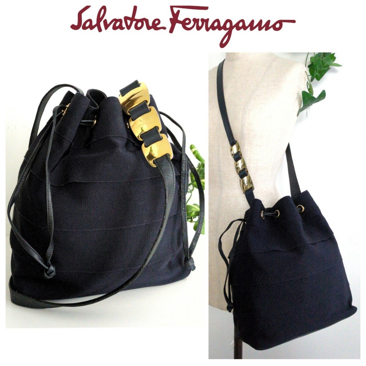 - 美品 フェラガモ ヴァラ フリル 巾着 ショルダーバッグ オールド ヴィンテージ 鞄 バケット 斜め掛け ネイビー ゴールド レディース メンズ