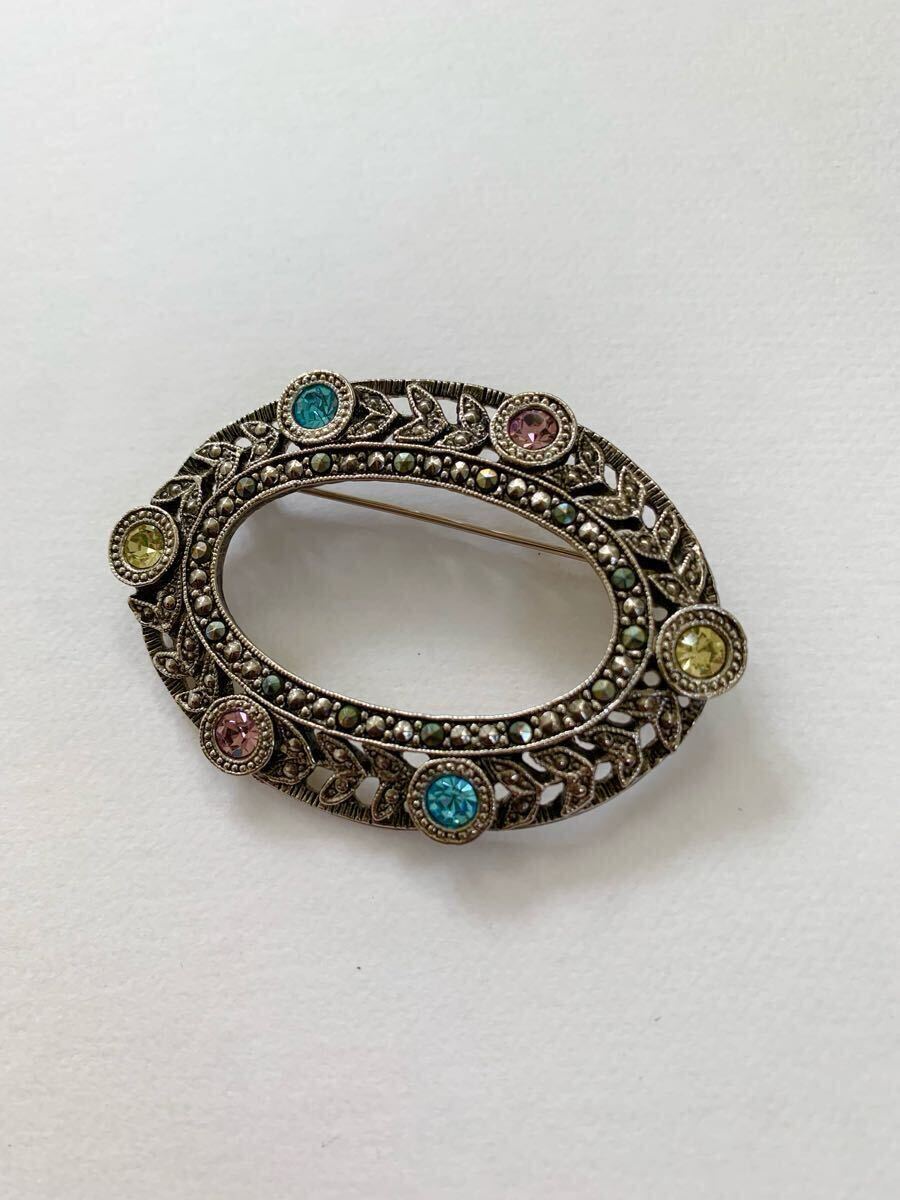 - 【美品】イギリス購入 ヴィンテージ オーバル マルチカラー ビジュー ブローチ シルバー トーン コスチュームジュエリー