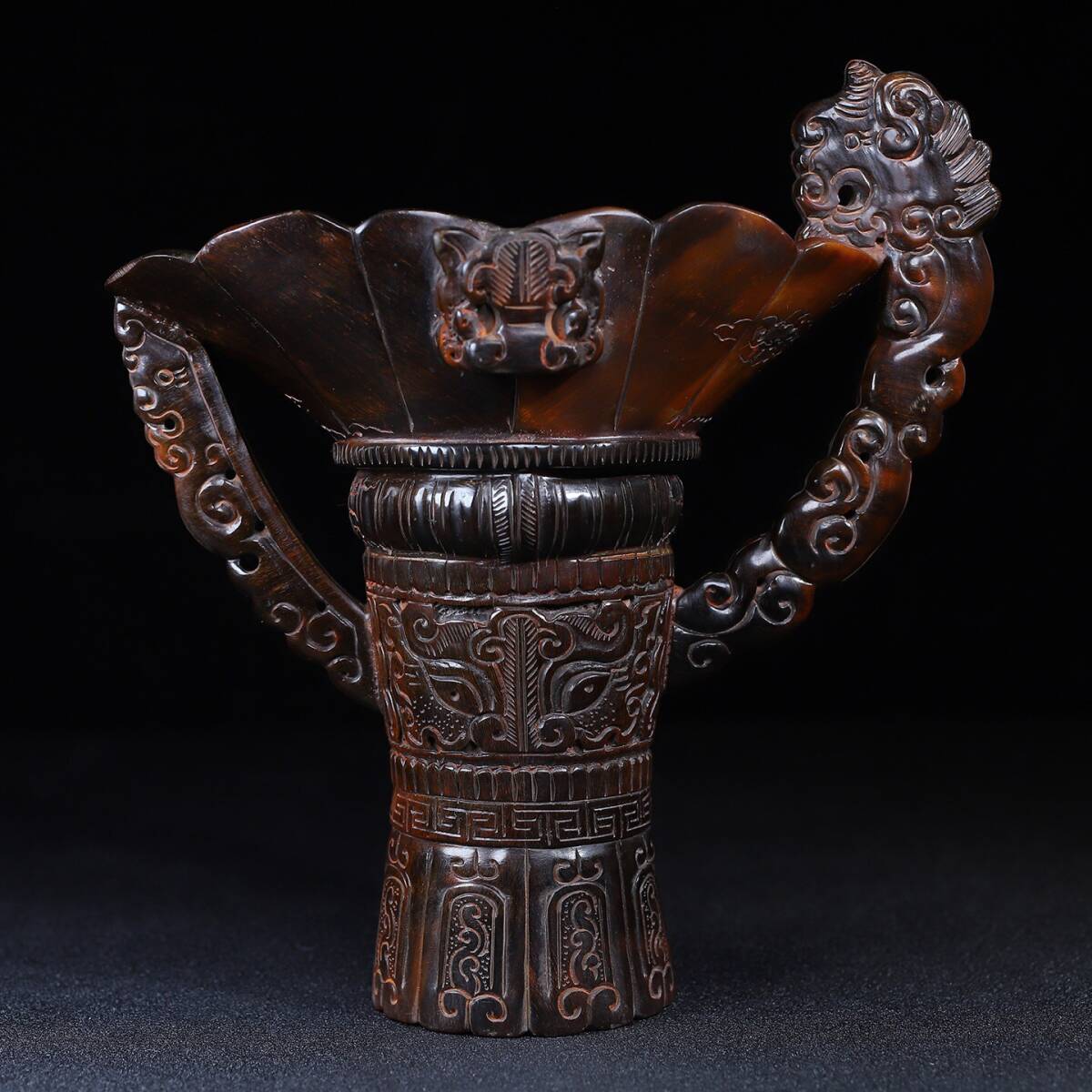 - ▽鴻▽ 角材細密彫 瑞獣酒杯 置物 古賞物 中国古玩 中国古美術