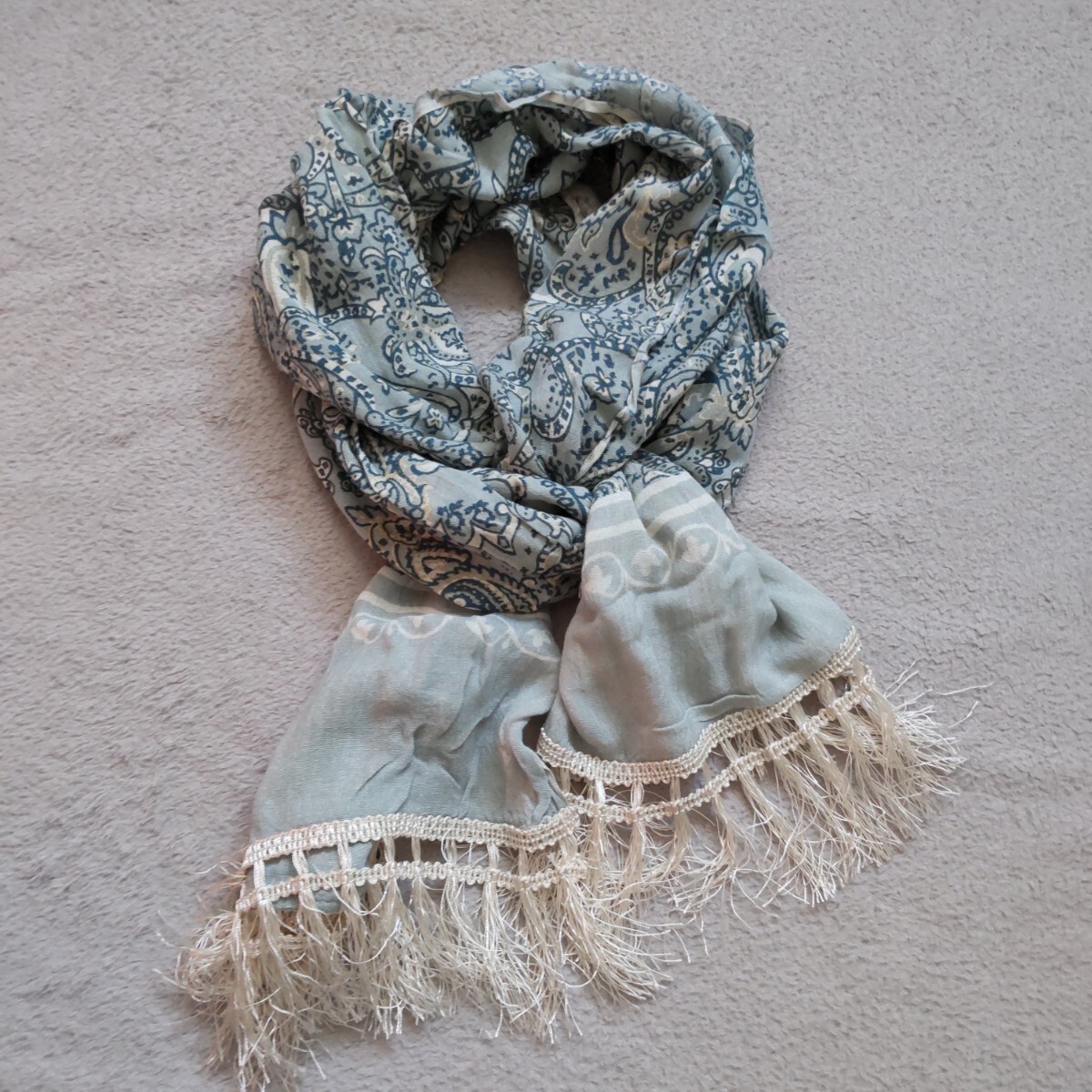 > ジュゼ ストール ショール スカーフ 春 夏 フリンジ付 ペイズリー柄 花柄 ブルー 水色 くすみ色 美品 テーブルランナー テーブルクロス