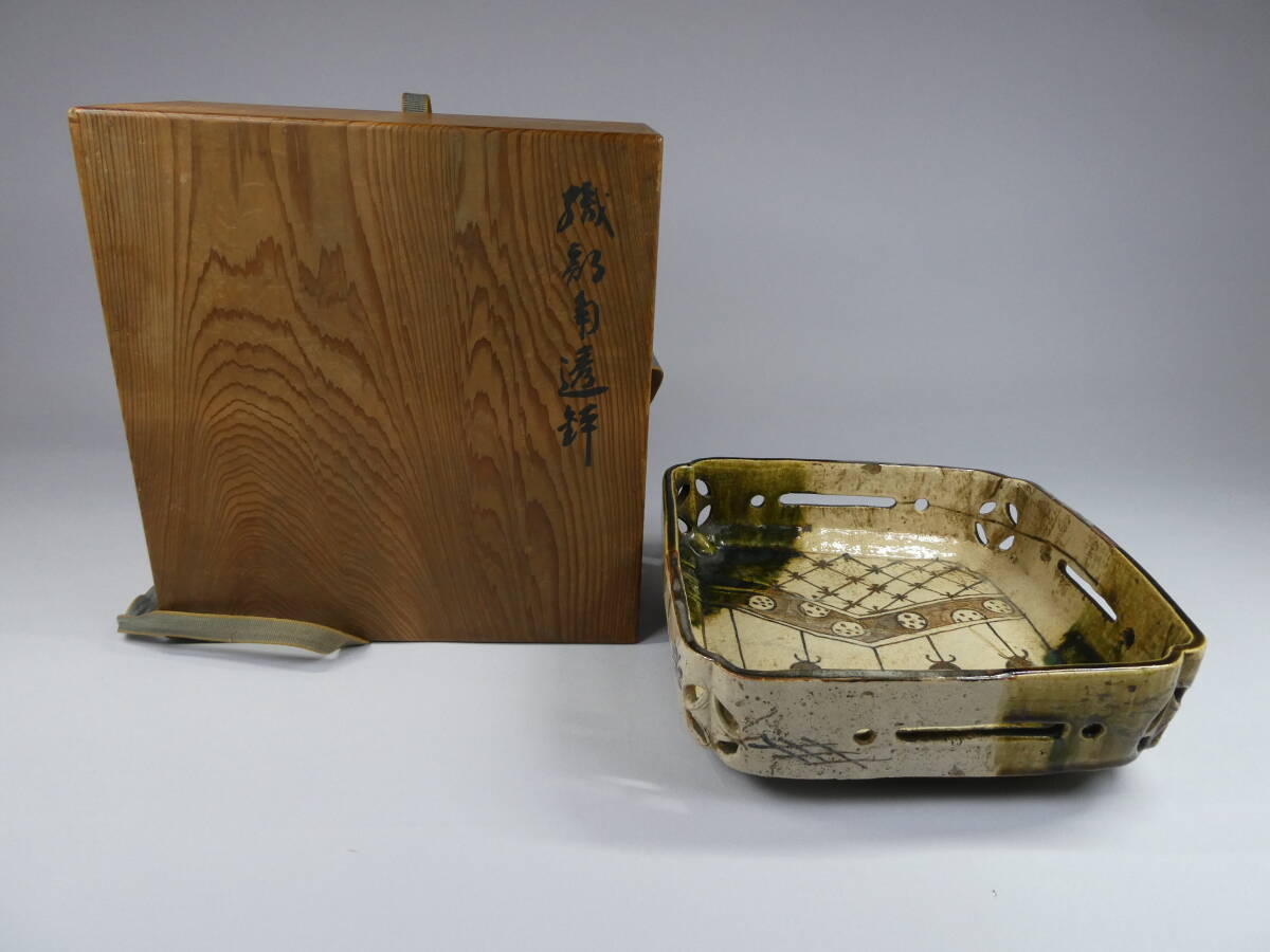 - 美濃織部焼 織部角透鉢 時代箱付