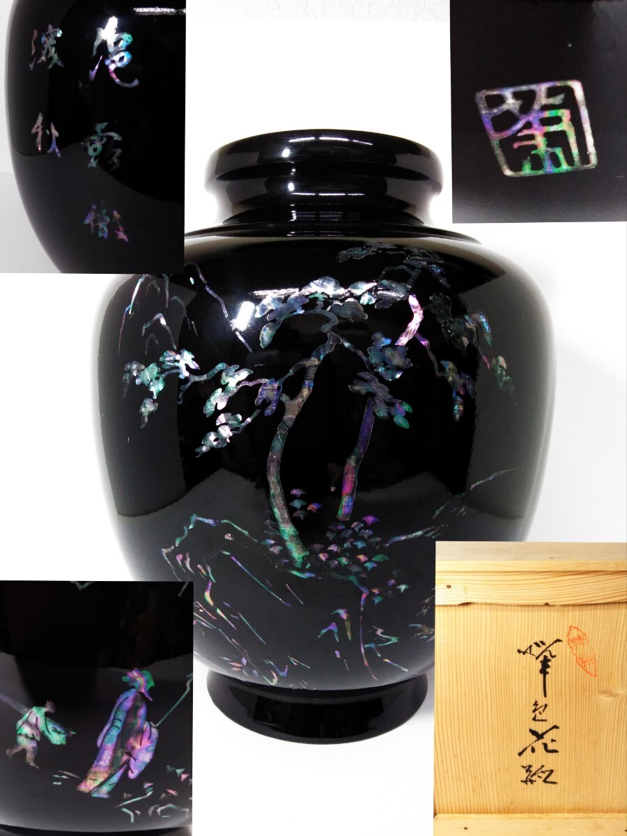 > 黒塗 螺鈿細工 印 仙人図 花瓶 漆器 漆芸 美術品 華道 貝細工 インテリア 床飾 (検索) 韓国 中国 工芸 美術 骨董 古玩 花入 花器 木製