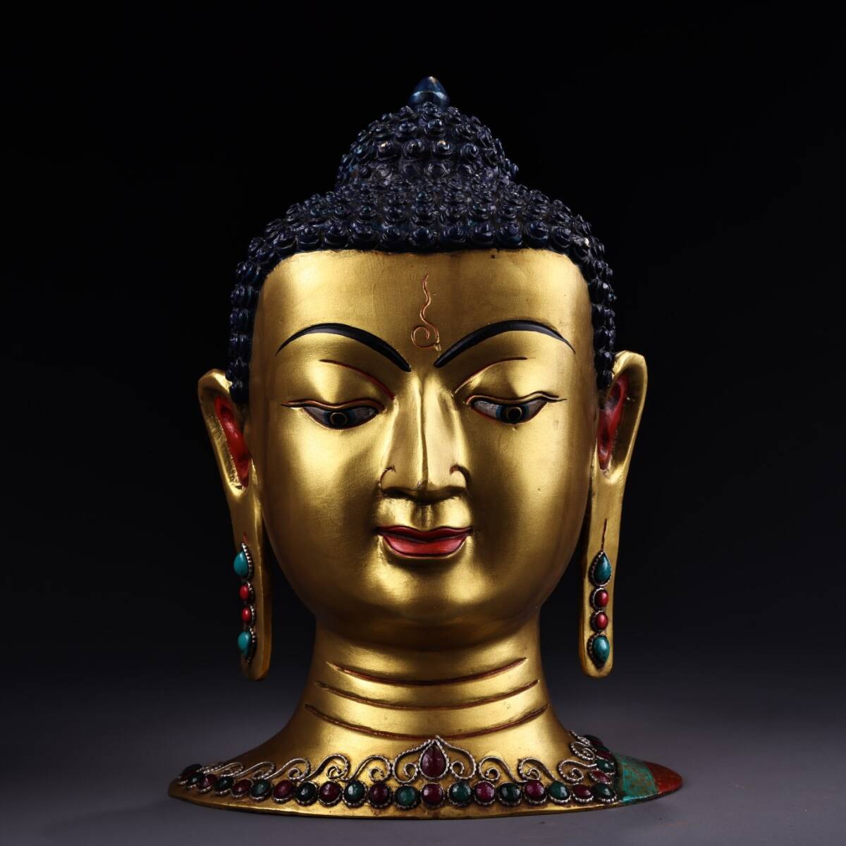 - 【超珍館蔵】銅製 寶石嵌 描金 彩繪 釋迦牟尼仏頭 置物 古賞物 古美術品 稀少珍蔵品
