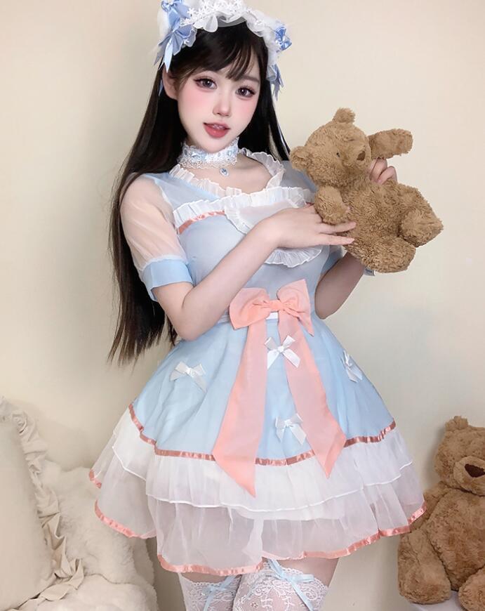 - 219 ワンピースladiesレディース ◇良質 魅惑Styleセクシー ◇ ボウタイ装飾 水色