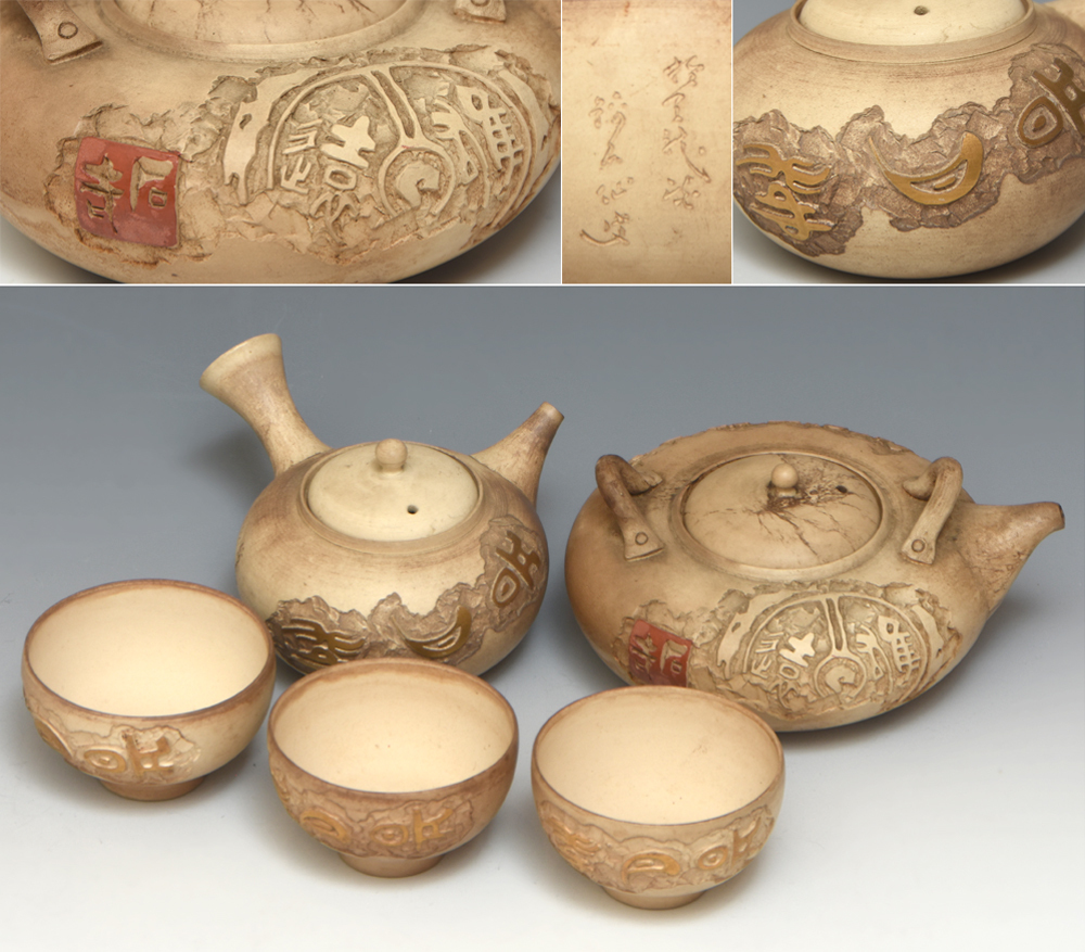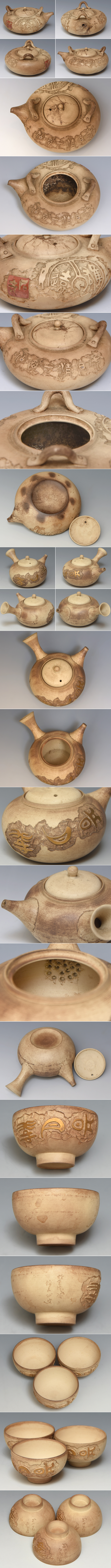 - 石峰仙史 天竜峡焼 白泥 篆刻陶器 煎茶器セット 湯沸かし・急須・煎茶碗3客 天龍峡焼 陶磁器 長野県 ボーフラ 錦石仙史 z9848o