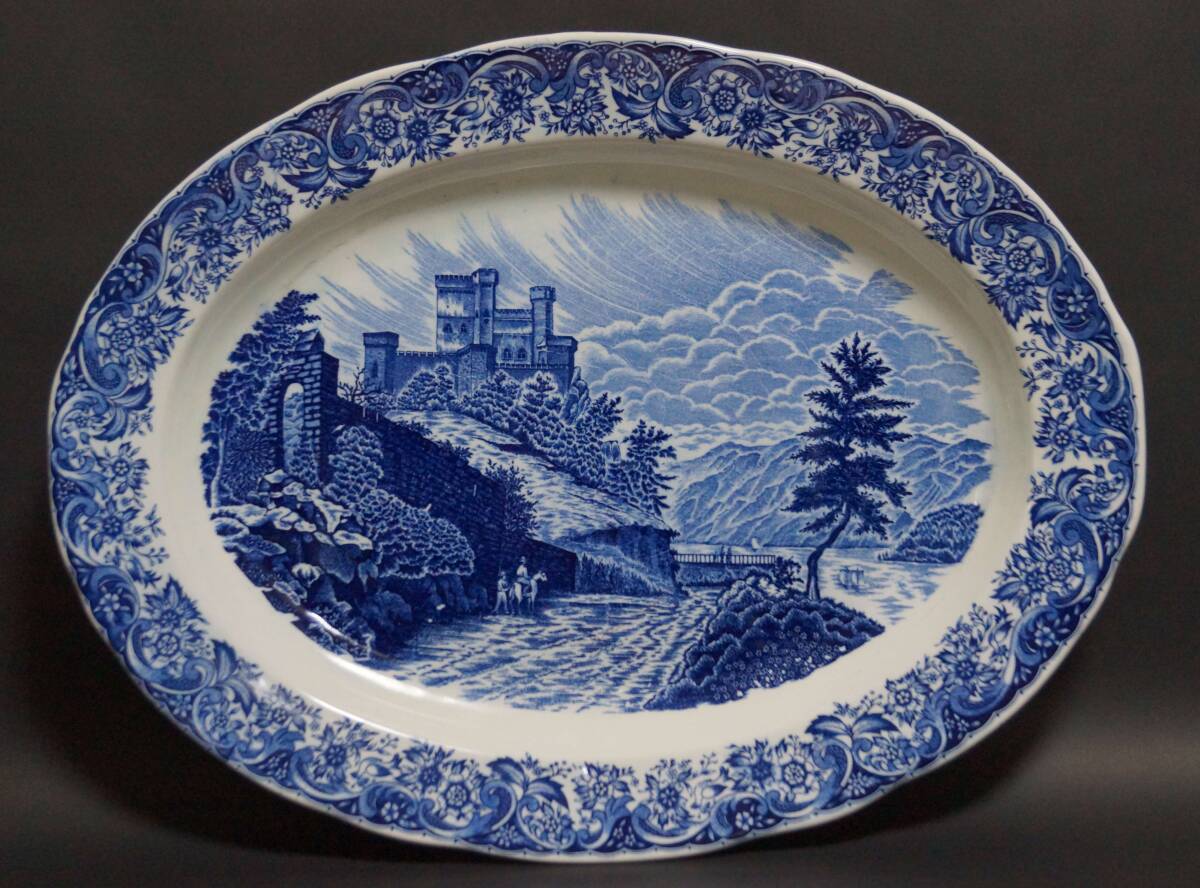 - 【閑】昭和レトロ 印判 『ヨーロッパ城人物風景図』 楕円形大型絵皿 飾り皿 幅47cm★時代物★7D0321