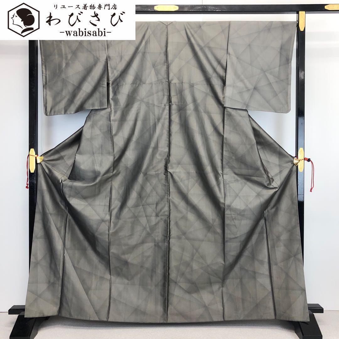 > 紬着物 幾何学模様 左胸に星模様 薄消炭色 トールサイズ K-3691 着物 きもの kimono 和服 和装 中古 リサイクル着物 【送料無料】