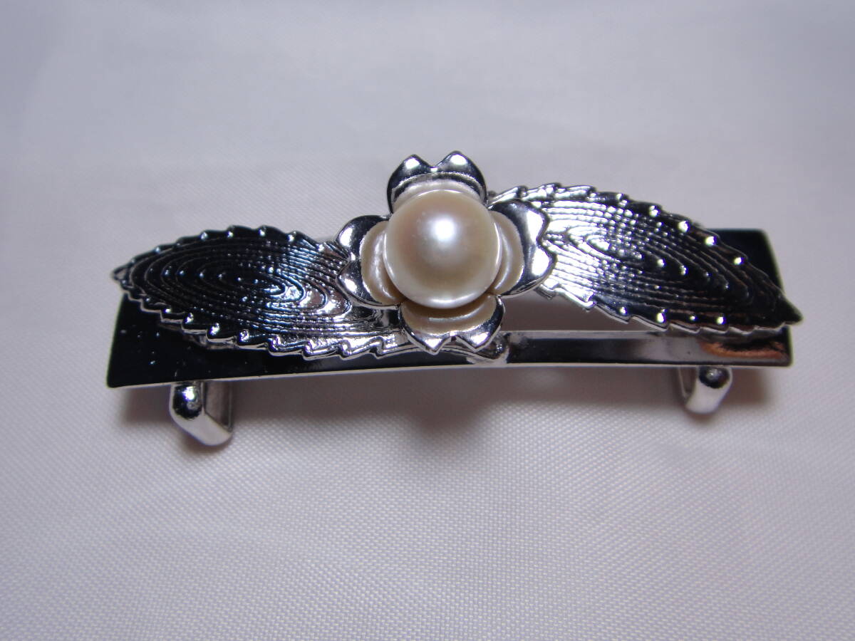 - アコヤ真珠 本真珠 帯留め 大玉! 約7.7㎜玉 一輪花と渦巻葉 ヴィンテージ 和装小物 Y531