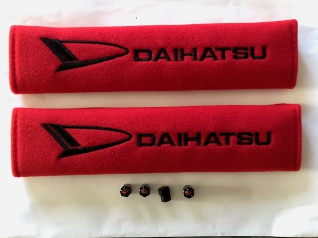 - セット割引、送料無料!目立つレッド!ダイハツロゴシートベルトパッド&タイヤバルブキャップ ロッキー ムーヴ ミラ コペン タント
