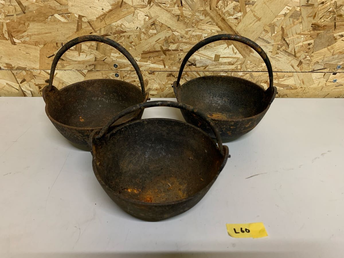 - 鉄鍋 古民具 南部鉄器 囲炉裏鍋 古道具 田舎鍋 鍋 小鍋 鉄製 15cm 当時物 時代物 セット L60