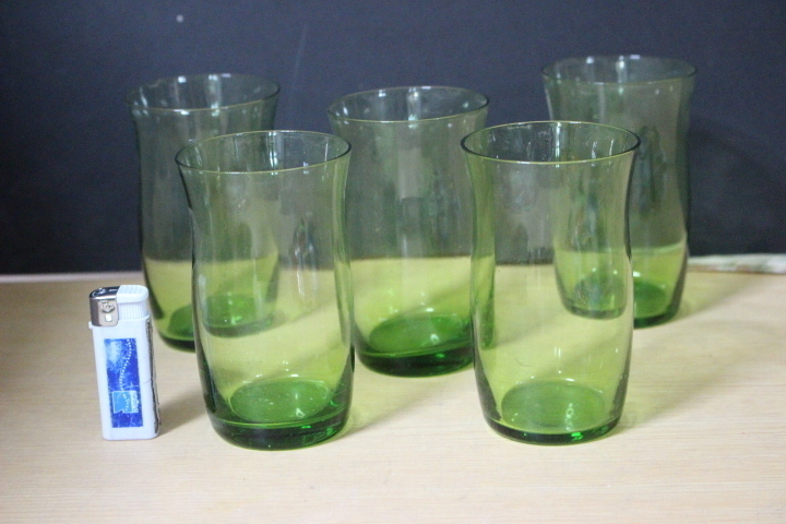 - 再■ み-297 【未使用】色ガラス グラス 5個 昭和レトロ コップ グリーン系 単品/約寸:高10cm 直径6cm