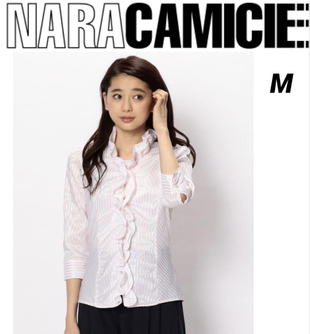- NARACAMICIE ナラカミーチェ サテンストライプ 衿フリル ストレッチ 七分袖シャツ M ピンク