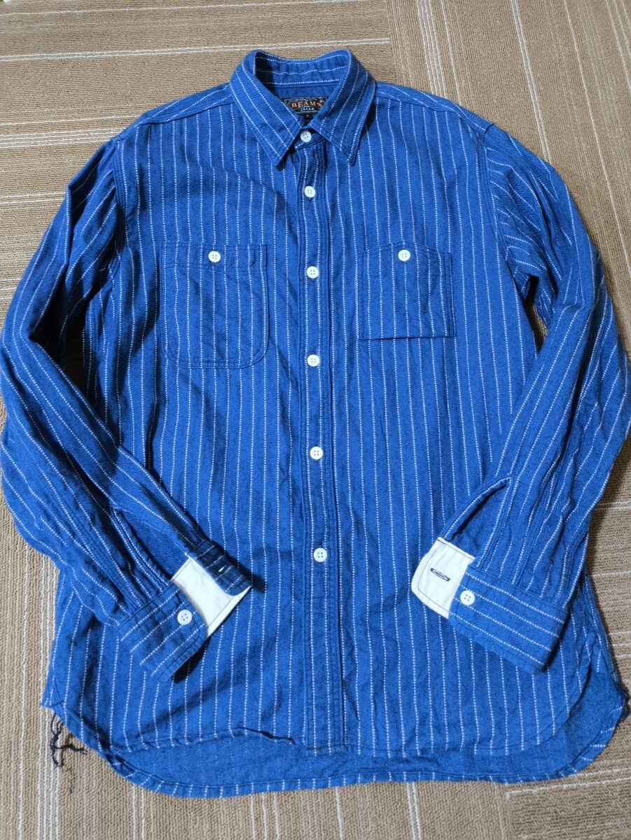- サイズ:S 美品 定価:28600円 日本製 BEAMS PLUS /インディゴ 抜染 ウォバッシュ プリントワークシャツ ビームスプラス 長袖シャツ