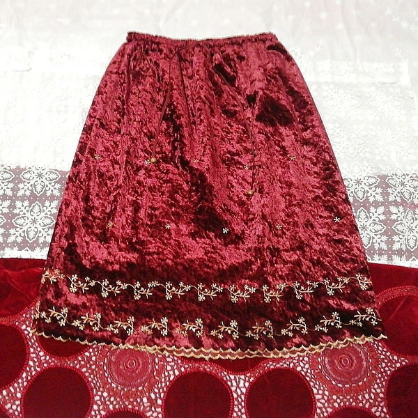 > ワインレッド豪華ベロア花柄刺繍ミディアムスカート Wine red luxurious velvet floral embroidered midi skirt