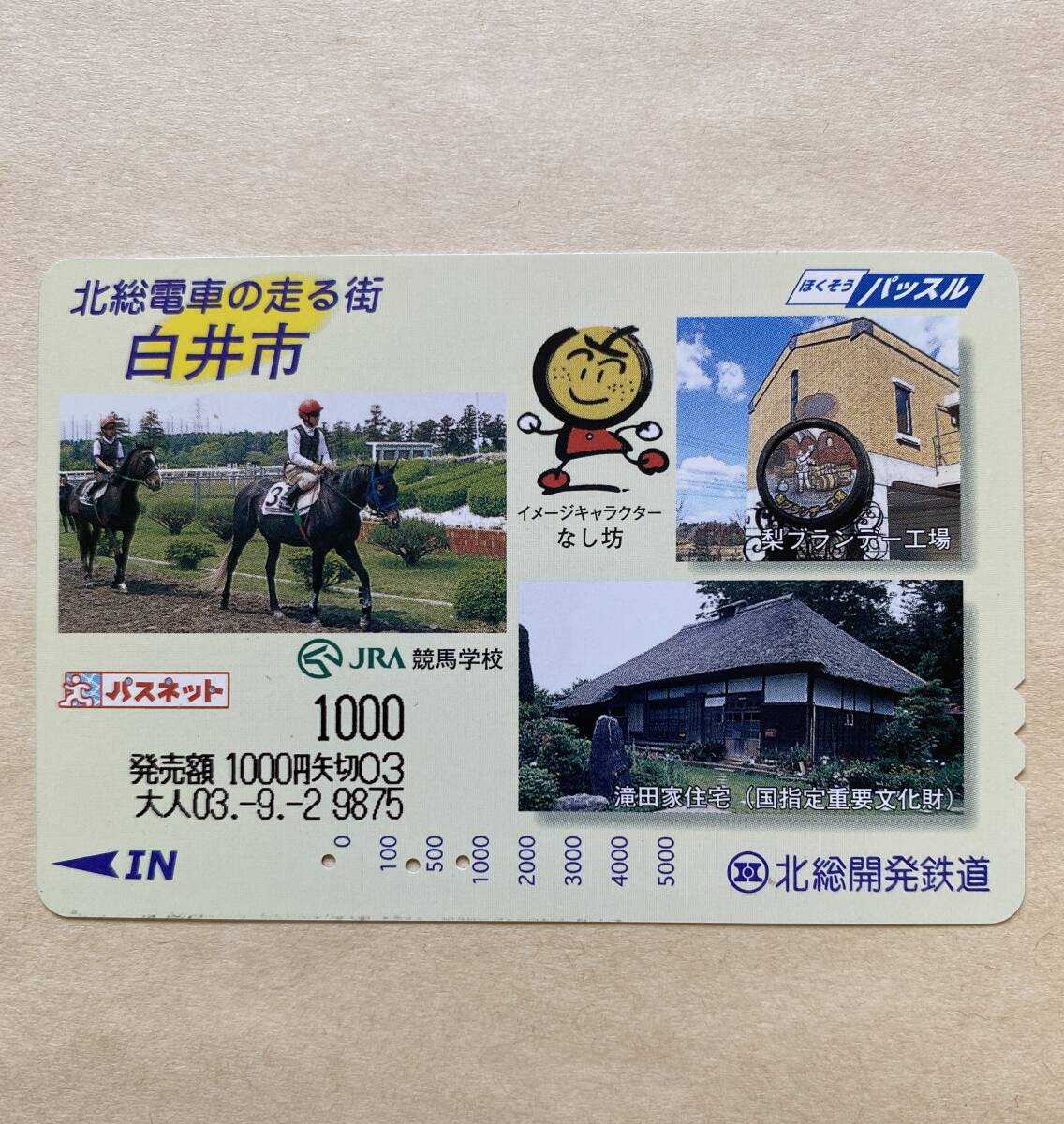 > 【使用済】 パスネット 北総鉄道 北総電車の走る街 白井市 JRA競馬学校 なし坊 梨ブランデー工場 滝田家住宅(国指定重要文化財)