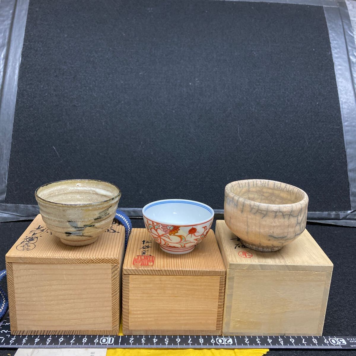 > 九谷焼 ☆(松谷窯) 赤絵唐草文盃 共箱、共布付き☆(大樋白釉) 酒器 年雄作 共箱付き☆(長高喜兵衞造)共箱、陶歴付き 三点組