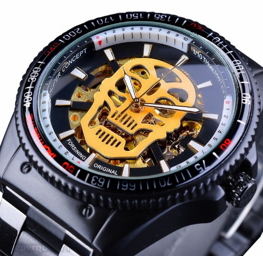 > 腕時計男性 新入荷 アナログ 機械式自動巻 3針 スカル メンズ ウォッチ 夜光表示 防水3ATM ステンレスベルト アメカジ/ゴールド