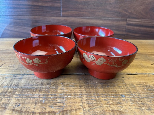 - Su.61★吸い物椀 4客セット★梅柄/朱色/和食/料亭/旅館/割烹/懐石/居酒屋/定食/ランチ/味噌汁/飲食店/業務用/中古品
