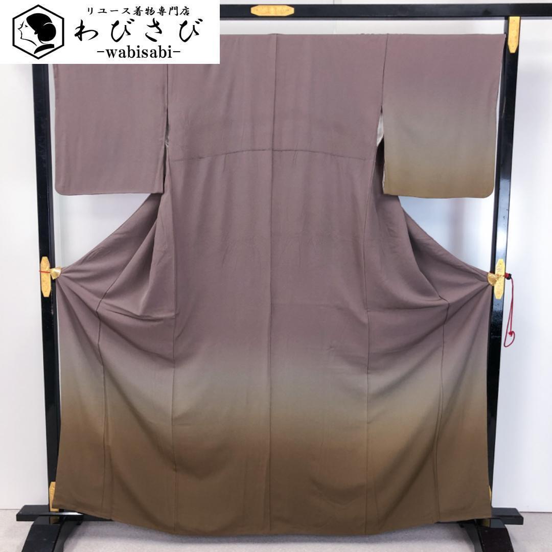 紅消鼠色ベースのお色味の縮緬に上品なグラデーションがデザインされた素敵な柄裄のお品でございます。