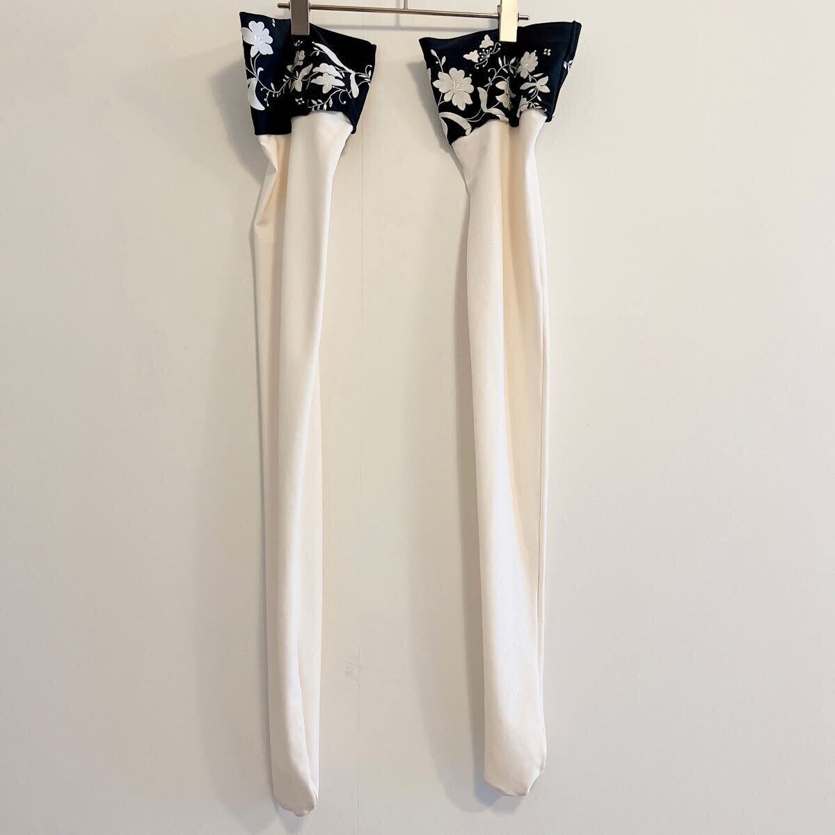 > 60's アンティークファブリックニーハイソックス 刺繍靴下 繊細ラメ 白黒 作家メイド アメリカ製 希少 1点物 ヨーロピアン antique 未使用