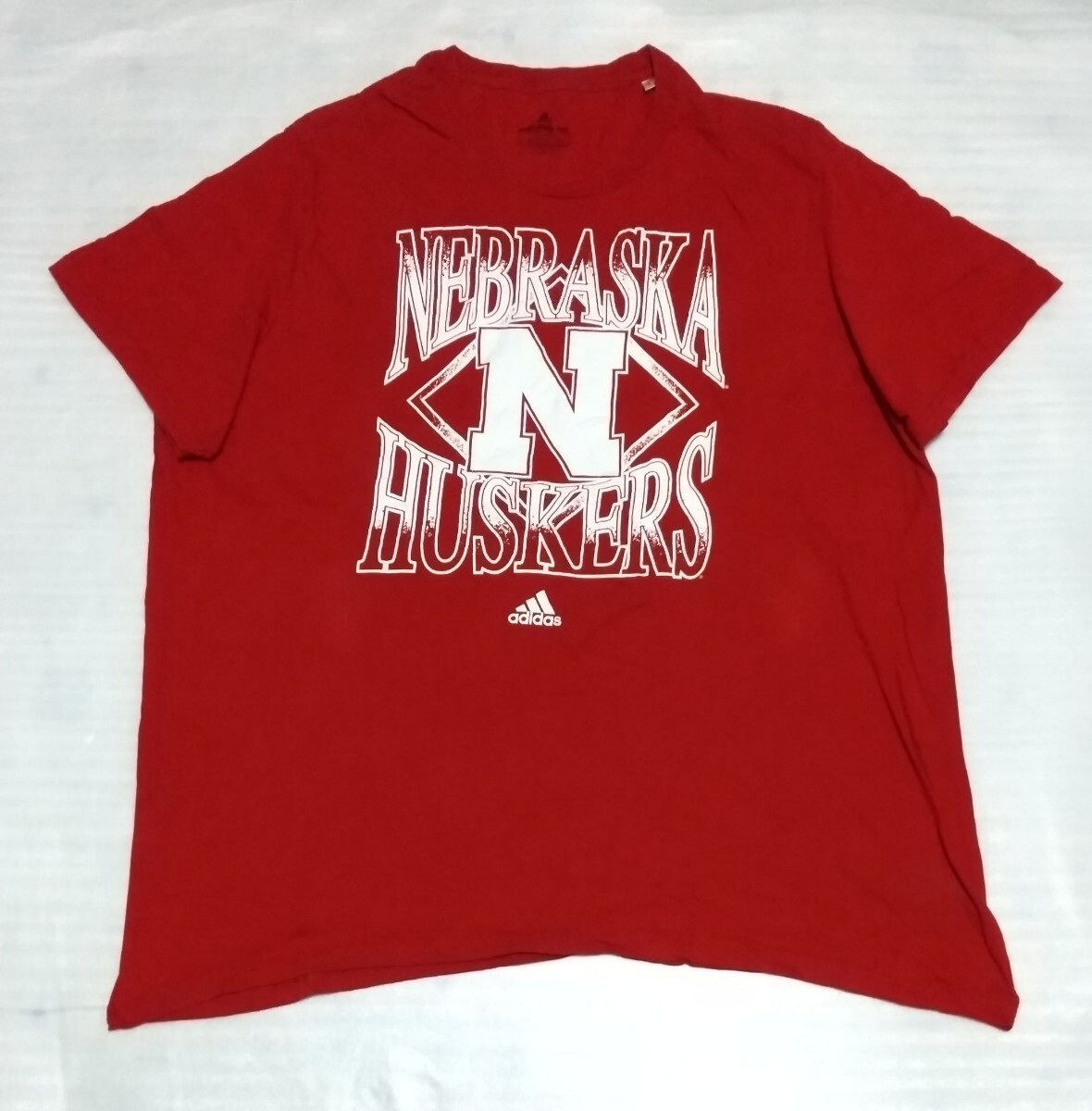 > ☆adidas.com AMPLIFIER TEEサイズ2XL半袖Tシャツ紅レッド赤色ラバー プリントNEBRASKA HUSKERSホワイト白スポーツ洗濯済ティー アディダス