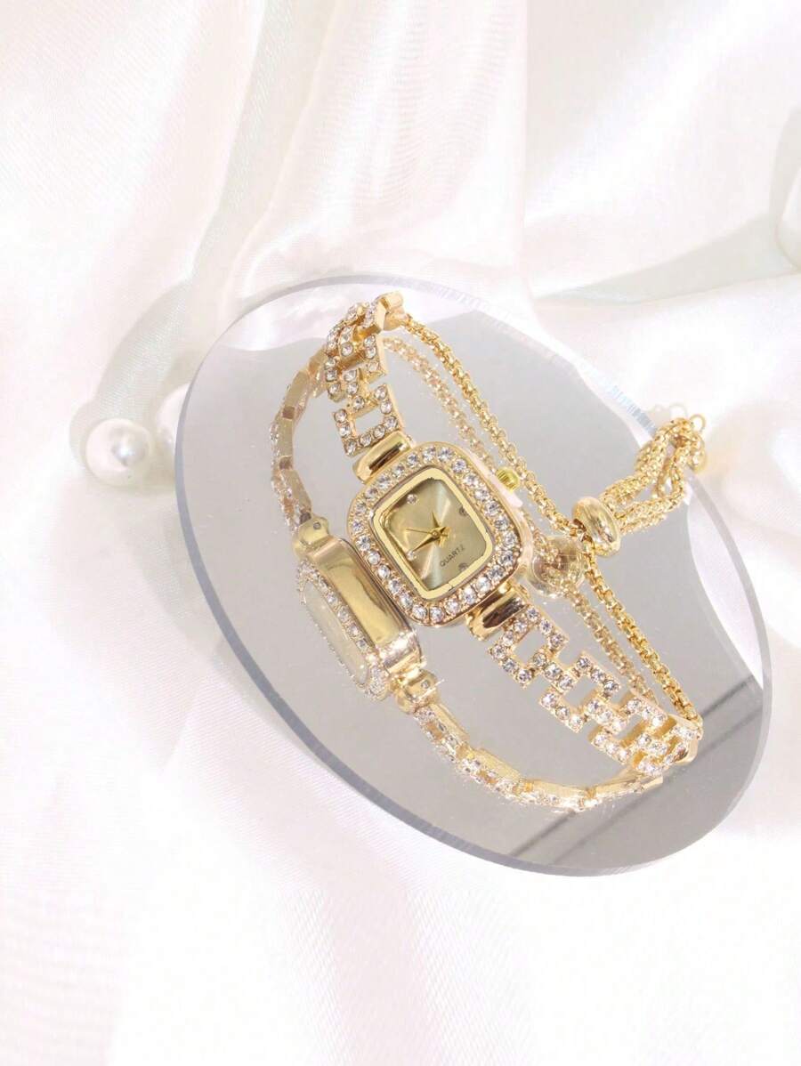 > 腕時計 レディース クォーツ 1個 レディース スクエアケース ゴールド クォーツ腕時計、ダイヤモンドマーカーダイヤル、調整可能な