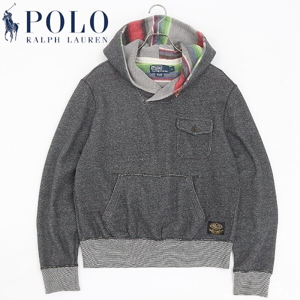 > 国内正規品◆POLO RALPH LAUREN ポロ ラルフローレン 裏地フリース レザー使い エルボーパッチ パーカー チャコールグレー L 国内正規品