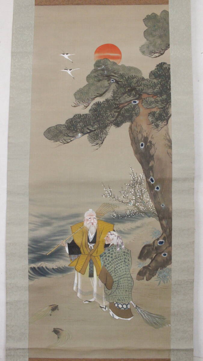- 【文明館】無落款 高砂 絹本 掛軸 書画 骨董 古美術 ス17