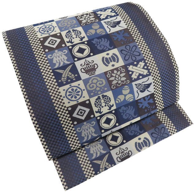 - 名古屋帯 なごや帯 中古 リサイクル 正絹 カジュアル 仕立て上がり 全通 市松模様 宝物 紺系色 多色 きもの北條 A1178-18