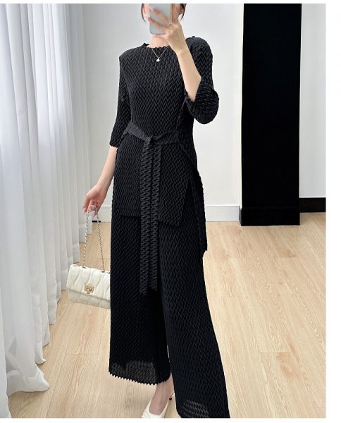 > 2504レディーストップスプリーツpleatsシャツブラウスワイドパンツ2点セット肌触り弾力ドレープ性がいい大人可愛いポケットありブラック