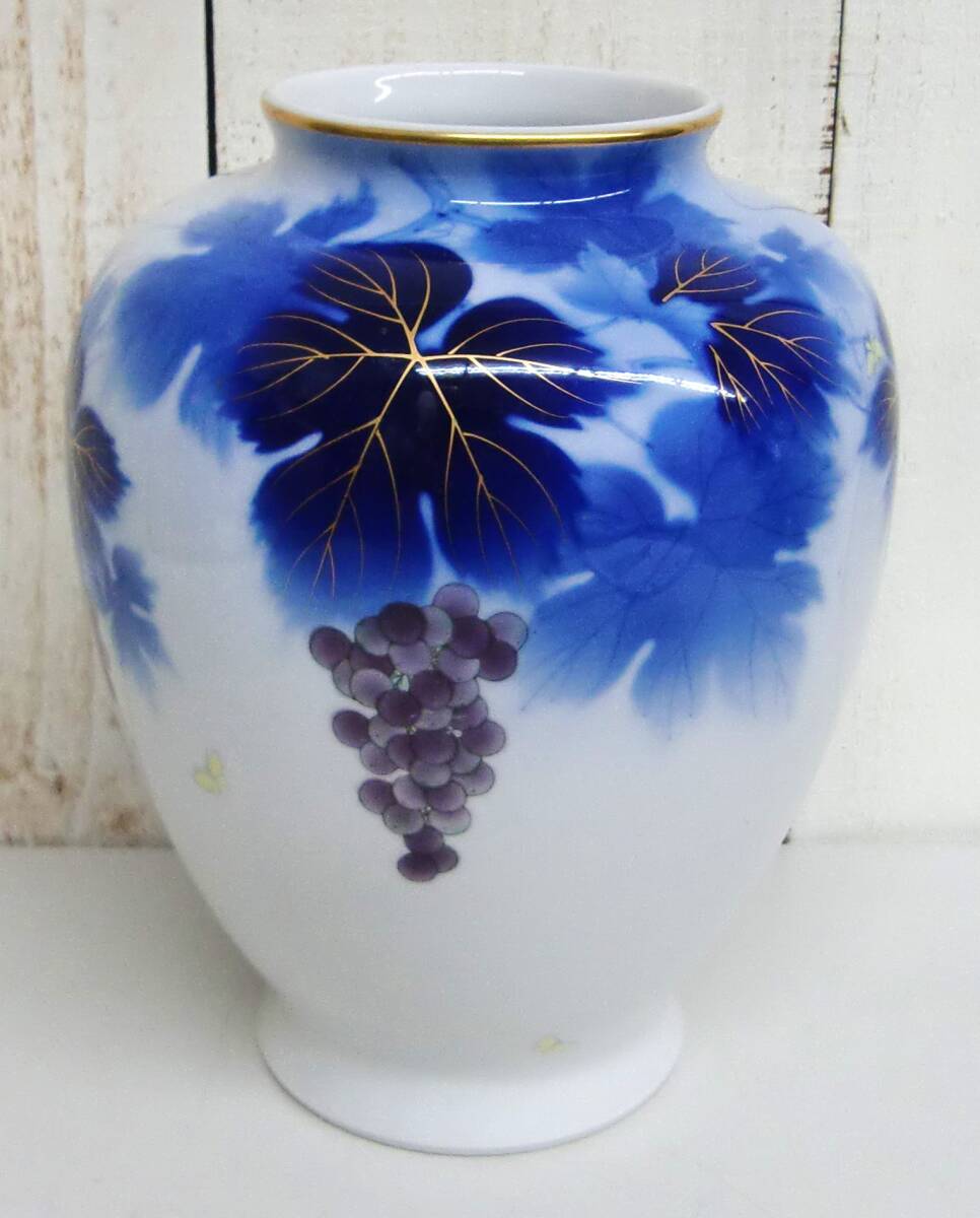 - *伝統工芸 工芸品 工芸美術 *深川製磁 深川製 *花瓶 花入 花生 フラワーベース 飾り壺 *金彩 染錦 ブドウ 葡萄 蝶々 *高さ 23cm