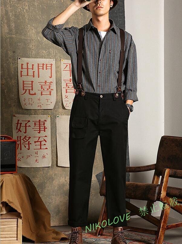 - 新品 メンズ ミリタリーヴィンテージ復刻スタイル コットン サスペンダーオーバーパンツ チノW28~W38 サスペンダー付き 黒