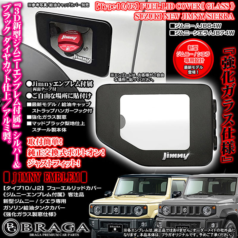 - JB74W 新型シエラ 2024型 タイプ10/J2/ジムニー エンブレム付属/客注品/給油口 フューエル リッド カバー/強化ガラス/艶消し黒/ブラガ