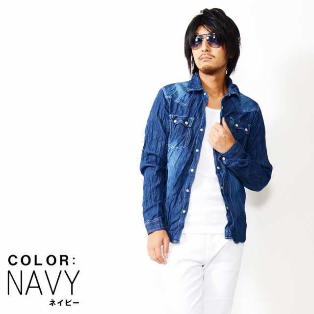- ヴィンテージウォッシュ加工デニムシャツ 長袖シャツ クリンクル シワ加工 81340 新品 ネイビー L