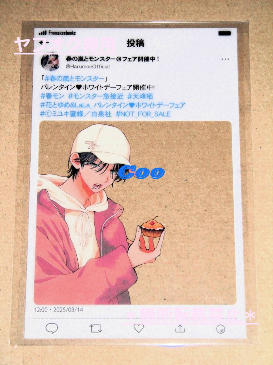 - ◆春の嵐とモンスター ミユキ蜜蜂 * 天峰栢 SNS風クリアカード◆メロンブックス 花とゆめ&LaLa バレンタインホワイトデーフェア2025