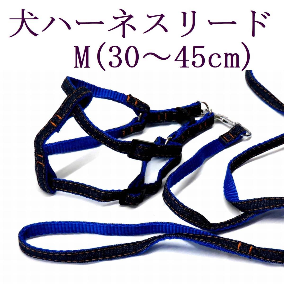 > ハーネス リードセット 青 M 中型犬 小型犬 デニム 胴回り30~45cm前後 リード 110cm 幅1.5cm ブルー 散歩 ペット用品 新品 送料無料