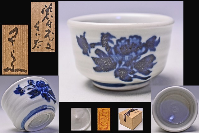 > 河本五郎 ★ 染付花文 ぐい呑 ★ 共箱 ★ ぐい呑 ★ お猪口 ★ 酒器 ★ 花模様 ★ 河本礫亭の養嗣子 ★ 瀬戸の現代陶芸 ★