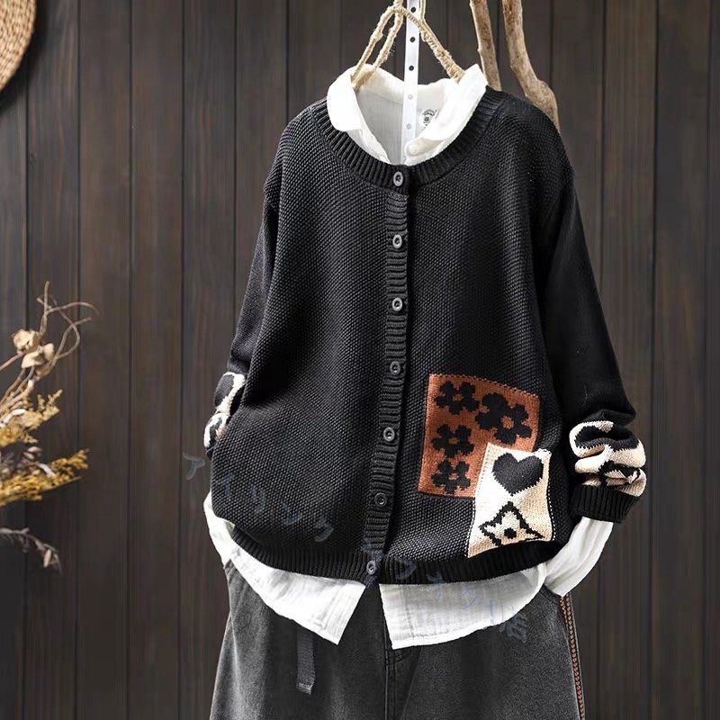 - 人気ニット セーター カーディガン プリントハート&花柄 ゆったり トップス チュニック フリーサイズ ナチュラル 綿 コットン お色選択可