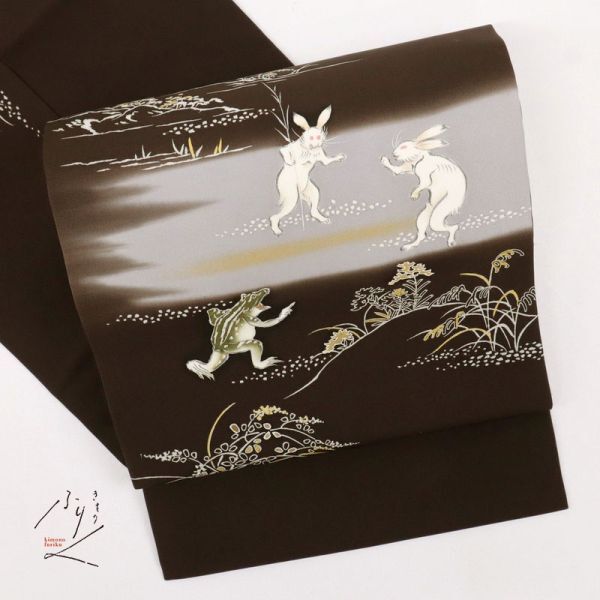- 【名古屋帯】 塩瀬 『鳥獣人物戯画文』 うさぎと蛙 焦茶 正絹着物 NC12-13