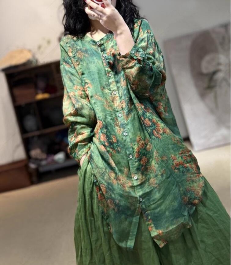 - 夏新入荷* レディース トップス ナチュラル プリント柄 大人体型カバー キレイめ 通勤 オフィス チュニック 長袖 総柄 ロングシャツ