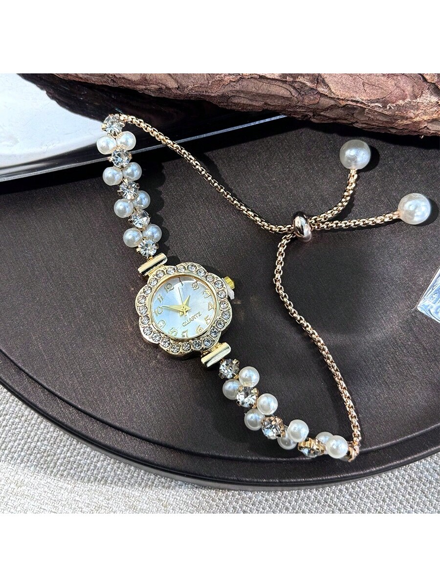 - 腕時計 レディース クォーツ 1個 レディース ファッション クオーツ 腕時計、真珠二連 ストリング、ラインストーン インレイ プ