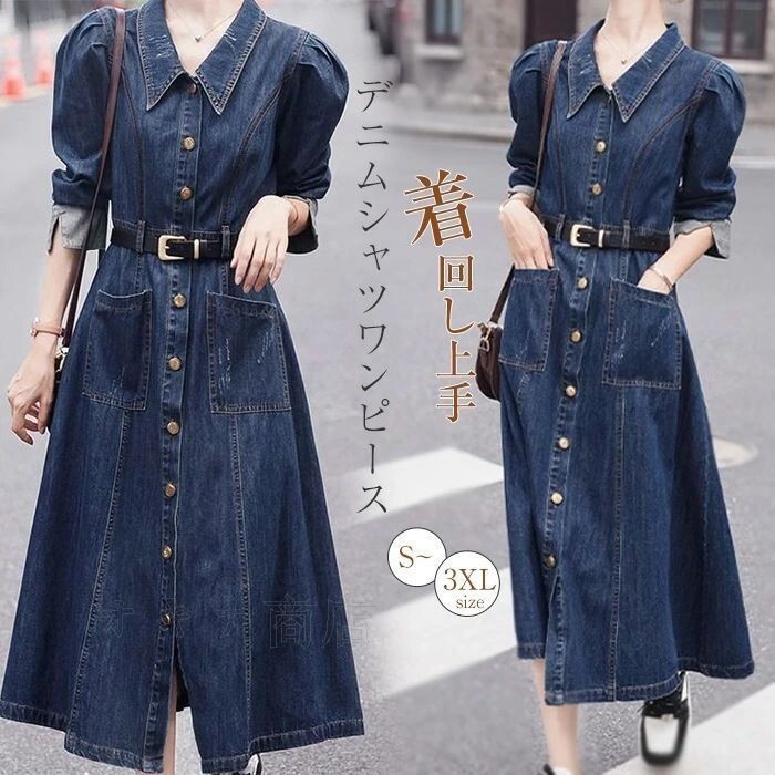 > デニムワンピース 長袖 レデイース ワンピース デニム ロングワンピース ロング丈 Aライン ひざ下 お出かけ 春秋 秋冬 20代 30代