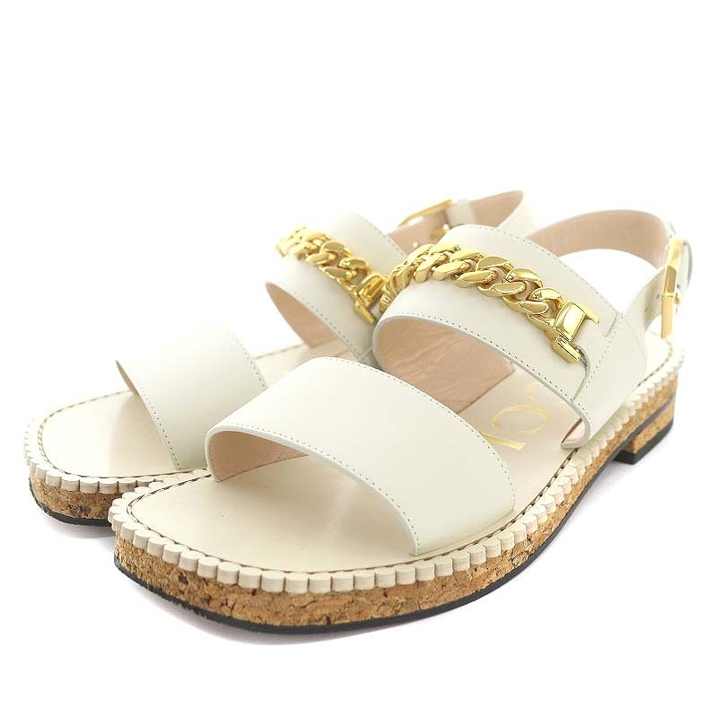 > グッチ GUCCI チェーン装飾ストラップサンダル スクエアトゥ ゴールド金具 ローヒール レザー 36.5 23.5cm ベージュ 655557 /DO ■OS レデ