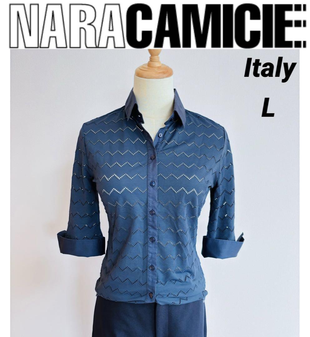 - NARACAMICIE ナラカミーチェ イタリア製 カットワーク 七分丈 シャツ ネイビー L