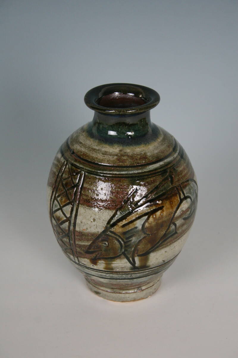 - 壺屋焼 人間国宝 金城次郎 作 刷毛目魚文花瓶(中)