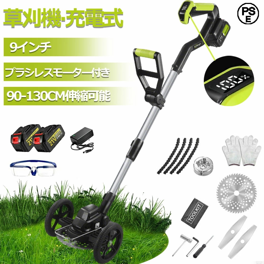 - 草刈り機 充電式 電動 21Vバッテリー*2付き 補助輪 替刃付き 女性 コードレス 多機能 ブラシレスモーター 9インチ 刈払機 伸縮式 枝切り