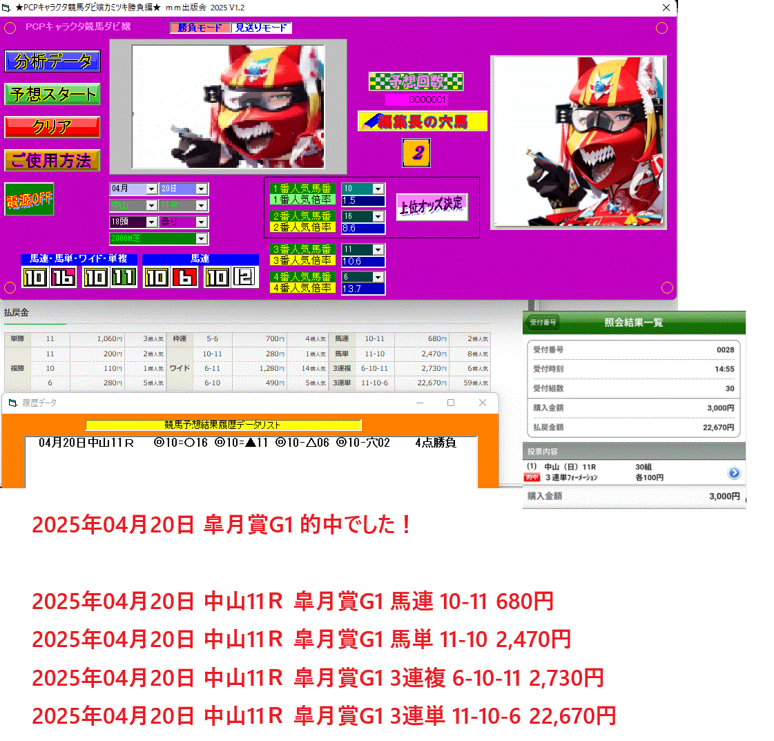 - 新作 競馬予想ソフト「PCPキャラクタ競馬ダビ嬢カミツキ勝負編」2025年皐月賞G1 3連単 11-10-6 22,670円 七夕祭