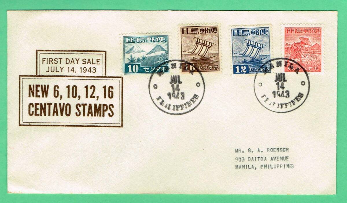 - 南方占領地切手 フィリピン 普通切手 1943 年7月14日 切手4枚 マニラ局 FDC
