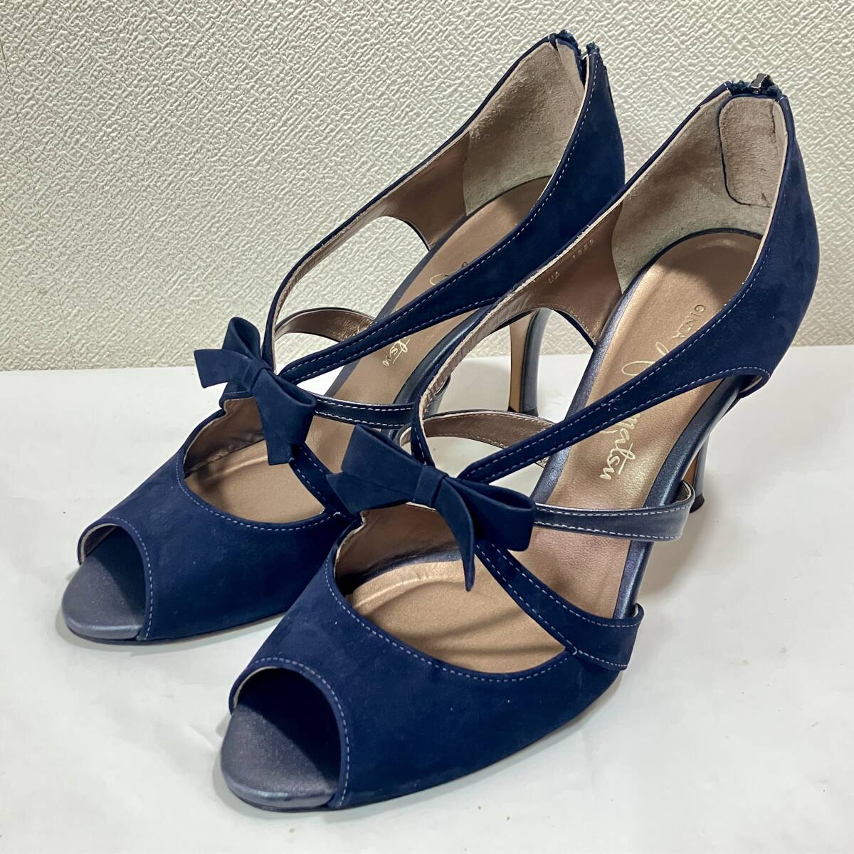 > 【良品】 GINZA Kanematsu 銀座かねまつ オープントゥ ハイヒール サンダル リボン 24cm ネイビー レディース 靴