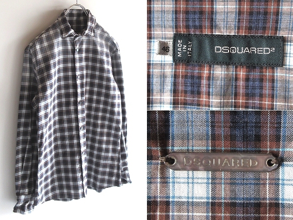 > ネコポス対応 DSQUARED2 ディースクエアード フェード加工 ミニロゴプレート ワイヤー襟 チェックシャツ 46 イタリア製 国内正規品